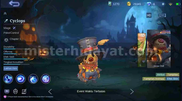 Yap bertepatan dengan event Halloween Moonton sudah menyiapkan dua skin Halloween yang pertama yaitu Skin Halloween Barats Baratstein yang sudah admin jelaskan di postingan sebelumnya dan yang kedua adalah skin Cyclops Straw Doll.
